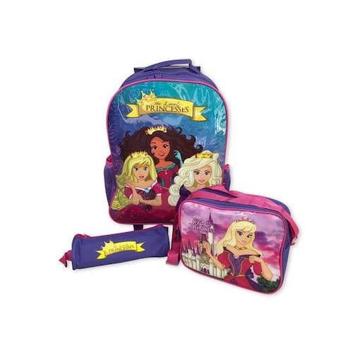 Kit Mochila Infantil Escolar Lancheira Estojo Princesa Roxa Kit Mochila Infantil Escolar Lancheira Estojo Princesa Roxa ===================================== Esse kit é perfeito para atender todas as necessidades da criança. Vem com uma mochila de rodinhas com compartimento principal espaçoso ideal para acomodar os livros, cadernos e materiais escolares no geral e mais dois bolsos laterais de redinha para garrafas.