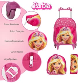 Kit Mochila Escolar Infantil Barbie Rodinhas, acompanha lancheira e estojo. Possui alça de mão reforçada. Agora você pode levar sua mochila no seu dia a dia ou acompanhar você na escola. Sua abertura maior se dá por zíper com puxador. Na parte de dentro possui amplo espaço para a guardar diversos materiais como cadernos, livros e estojos. Na parte da frente, possui bolso com zíper para a guardar pertences de menor tamanho e bolsos laterais.