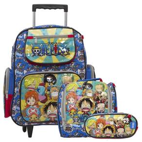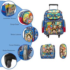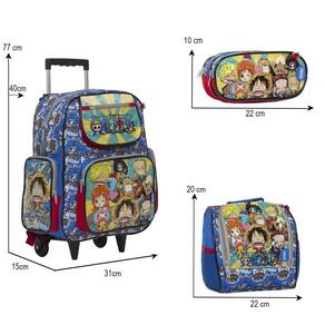 Kit Mochila Escolar Infantil One Piece Rodinhas, acompanha lancheira e estojo. Possui alça de mão reforçada. Agora você pode levar sua mochila no seu dia a dia ou acompanhar você na escola. Sua abertura maior se dá por zíper com puxador. Na parte de dentro possui amplo espaço para a guardar diversos materiais como cadernos, livros e estojos. Na parte da frente, possui bolso com zíper para a guardar pertences de menor tamanho e bolsos laterais.