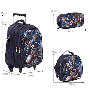 Kit Mochila Escolar Infantil Batman Rodinhas, acompanha lancheira e estojo. Possui alça de mão reforçada. Agora você pode levar sua mochila no seu dia a dia ou acompanhar você na escola. Sua abertura maior se dá por zíper com puxador. Na parte de dentro possui amplo espaço para a guardar diversos materiais como cadernos, livros e estojos. Na parte da frente, possui bolso com zíper para a guardar pertences de menor tamanho e bolsos laterais.