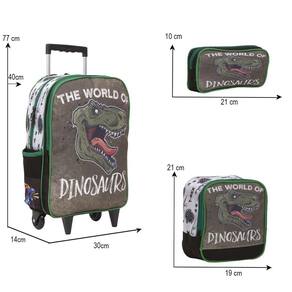 Kit Mochila Escolar Infantil Dinossauro Rodinhas, acompanha lancheira e estojo. Possui alça de mão reforçada. Agora você pode levar sua mochila no seu dia a dia ou acompanhar você na escola. Sua abertura maior se dá por zíper com puxador. Na parte de dentro possui amplo espaço para a guardar diversos materiais como cadernos, livros e estojos. Na parte da frente, possui bolso com zíper para a guardar pertences de menor tamanho e bolsos laterais.