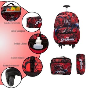 Kit Mochila Escolar Infantil Homem Aranha Rodinhas, acompanha lancheira e estojo. Possui alça de mão reforçada. Agora você pode levar sua mochila no seu dia a dia ou acompanhar você na escola. Sua abertura maior se dá por zíper com puxador. Na parte de dentro possui amplo espaço para a guardar diversos materiais como cadernos, livros e estojos. Na parte da frente, possui bolso com zíper para a guardar pertences de menor tamanho e bolsos laterais.