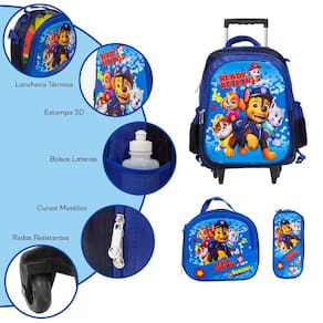 Kit Mochila Escolar Infantil Patrulha Canina Rodinhas, acompanha lancheira e estojo. Possui alça de mão reforçada. Agora você pode levar sua mochila no seu dia a dia ou acompanhar você na escola. Sua abertura maior se dá por zíper com puxador. Na parte de dentro possui amplo espaço para a guardar diversos materiais como cadernos, livros e estojos. Na parte da frente, possui bolso com zíper para a guardar pertences de menor tamanho e bolsos laterais.