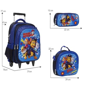 Kit Mochila Escolar Infantil Patrulha Canina Rodinhas, acompanha lancheira e estojo. Possui alça de mão reforçada. Agora você pode levar sua mochila no seu dia a dia ou acompanhar você na escola. Sua abertura maior se dá por zíper com puxador. Na parte de dentro possui amplo espaço para a guardar diversos materiais como cadernos, livros e estojos. Na parte da frente, possui bolso com zíper para a guardar pertences de menor tamanho e bolsos laterais.