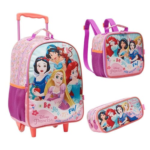 Conheça o Kit Escolar Infantil de mochila de rodinhas, lancheira e estojo triplo Princesas: as pequenas vão adorar viver um conto de fadas na escola ao lado das princesas Leve a magia dessas incríveis personagens para sua casa com Ariel, Rapunzel, Jasmine e Branca de Neve. Cada princesa traz sua própria história única, repleta de coragem e determinação. Com detalhes encantadores e cores vibrantes, o kit escolar transforma a rotina escolar em uma verdadeira viagem mágica. Nossos produtos são licenciados oficiais Disney, feitos em material resistente e acabamentos duráveis, garantindo conforto e estilo para as pequenas Material: PVC , poliéster 420D e lancheira com PEVA DIMENSÕES: Mochila - Largura: 30cm - Altura: 40cm - Comprimento: 15cm Peso: 1100gr Lancheira - Largura: 20.5cm - Altura: 25cm - Comprimento: 14.5cm Peso: 300gr Estojo - Largura: 20.5cm - Altura: 9cm - Comprimento: 11cm Peso: 150gr Ean: 7796314434817