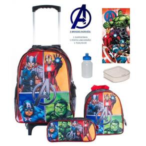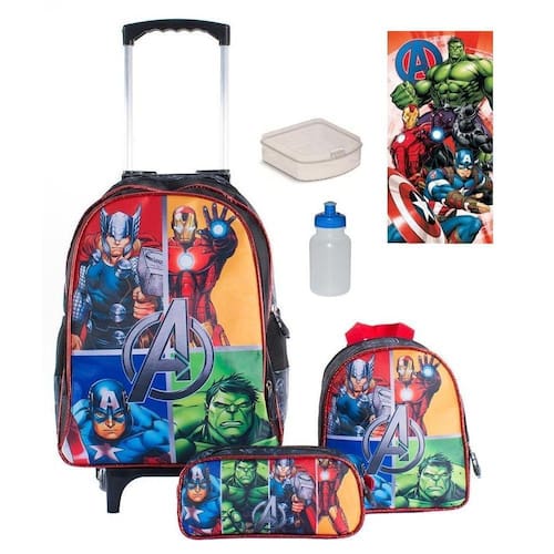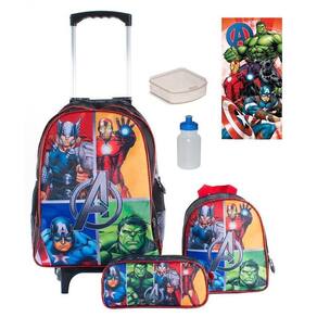 Kit mochila infantil rodinhas vingadores+ lancheira + estojo Mochila de rodinhas infantil masculina vingadores com lancheira térmica e estojo combinando na mesma estampa ideal para escola ou viagem.Mochila exclusiva para quem procura qualidade, estilo, modernidade e praticidade. Possui um ótimo espaço já que contém dois compartimentos com zíper e dois bolsos externos laterais. Suficiente para carregar livros, cadernos, agenda e estojo. Vem junto lancheira térmica que encaixa no carrinho de mão e conserva temperatura de alimentos e bebidas. Ideal para uso escolar ou viagem.Estampa atual, versátil e indispensável no dia-a-dia. Especificações mochila:- mochila com as seguintes medidas aproximadas 31cm x 42cm x 26cm.- carrinho de mão com a altura máxima aproximada de 82cm.- confeccionadas em material poliéster de ótima qualidade.- estampa colorida por toda mochila.- 2 compartimentos externos bolsos , ideal para garrafa de água ou objetos pequenos.- 2 compartimentos grandes com zíperes.- alça de mão.- alças ajustáveis e ergonômicas.- amplo espaço interno. Especificações da lancheira térmica:- lancheira térmica com as seguintes medidas 21cm x 23cm x 12cm.- confeccionadas em material sintético de qualidade.- estampa colorida por toda lancheira.- alça de mão.- alças ajustáveis.- amplo espaço interno. Especificações do estojo:- estojo com as seguintes medidas 23cm x 12cm x 6cm.- confeccionados em material sintético de qualidade.- estampa colorida por todo estojo.- amplo espaço interno para canetas, régua de até 15cm, lápis de cor, lapiseira e borracha. Observações:Enviamos junto com o kit,- 1 toalha de mão.- 1 garrafinha.- 1 porta lanche. Todos os produtos são conferidos para o envioProduto 100% novoProduto com garantia Marca: Mosaner Store