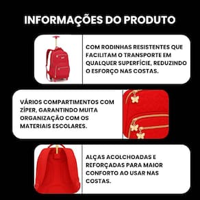 - Vários compartimentos com zíper, garantindo organização eficiente dos materiais escolares.