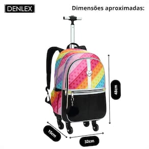 Kit Mochila Juvenil Rainbow Star Rodinhas Alças G Denlex Cor: Preta Kit Mochila Juvenil Feminina Rainbow Star Rodinhas Alças G 19 Denlex O kit Mochila Juvenil Feminina Rainbow Star Denlex é a escolha perfeita para quem busca estilo, funcionalidade e conforto no dia a dia. Com design moderno, o kit inclui uma mochila de rodinhas com alças de costas e amplo espaço interno, ideal para acompanhar a rotina escolar, viagens ou passeios, uma lancheira térmica e um estojo grande e funcional. Características Principais: Design Exclusivo: Combina tons vibrantes e alegres, trazendo um toque de personalidade e estilo. Material Durável: Fabricada com materiais de alta qualidade, a mochila é resistente ao uso diário e fácil de limpar. Mochila: Amplo Espaço Interno: Perfeito para carregar livros, cadernos, material escolar e itens pessoais com organização e praticidade. Rodinhas Resistentes e Alça Retrátil: As 4 rodinhas com giro 360 garantem fácil transporte, enquanto a alça retrátil proporciona praticidade no uso. Alças de Costas Ajustáveis: Para maior conforto, as alças são acolchoadas permitindo o uso como mochila tradicional. Compartimentos Inteligentes: Possui 3 bolsos externos para organizar objetos menores como estojo, carteira ou garrafa de água e um bolso frontal espaçoso. Lancheira: Sistema térmico: Perfeito para manter a temperatura do lanche por mais tempo. Estojo: Organizadores: para lápis e canetinhas Benefícios: Versatilidade: a mochila pode ser Utilizado como mochila de rodinhas ou de costas, atendendo a diferentes necessidades e preferências. Estilo Jovem e Moderno: Ideal para quem gosta de peças com personalidade. Conforto e Praticidade: O design ergonômico e os compartimentos espaçosos tornam o dia a dia mais organizado e confortável. Especificações Técnicas Dimensões aproximadas da mochila: 48cm de altura x 30cm de largura x 15cm de profundidade. Capacidade: grande, ideal para transportar materiais escolares e itens de uso diário. Material: poliéster resistente com detalhes reforçados. Rodinhas: 4 rodinhas com giro 360º de alta durabilidade e alça retrátil com ajuste de altura. Dimensões aproximadas da lancheira: 24cm de altura x 23cm de largura x 13cm de profundidade. Dimensões aproximadas do estojo: 6,5cm de altura x 23cm de largura x 15cm de profundidade. Conteúdo da embalagem: 1 Mochila, 1 Lancheira térmica, 1 estojo Principais perguntas: A mochila possui rodinhas resistentes sim, as rodinhas são feitas de material de alta qualidade, garantindo durabilidade e fácil movimentação em diversas superfícies. É possível usá-la como mochila de costas sim, a mochila possui alças convenientes e acolchoadas, permitindo o uso confortável como mochila tradicional. A mochila tem compartimento para notebook embora não tenha compartimento exclusivo para notebook, seu espaço interno é amplo e pode acomodar equipamentos de tamanho médio.