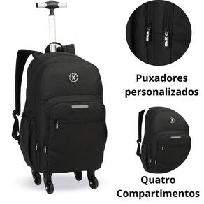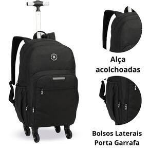 Característica da Mochila: -Medidas: 48cm x 31cm x 18cm -Puxadores Personalizados -Quatro Divisórias -Rodas de Silicone 360º -Bolsos Laterais Porta Garrafa -Carrinho Embutido -100%Poliéster