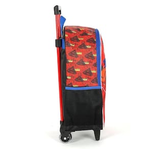 Kit mochila de rodinhas com bolsos laterias em tela com elástico, não possui alças de costas, silk frontal, alça de mão. Lancheira estampada com alça de costas e alça de mão, além de etiquetas personalizadas.