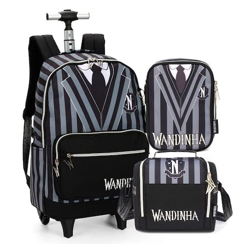 Contém: 01 un - mochila de rodinhas wandinha uniforme preto. 01 un - lancheira wandinha térmica preto 01 un - estojo box wandinha uniforme preto.