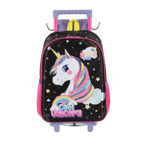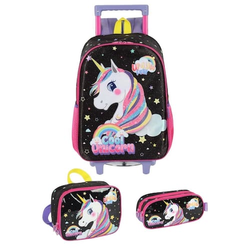 Descrição Kit infantil feminino com policromia. Contém: Mochila de carrinho 16, lancheira e estojo. - Medidas da mochila : 30 x 41 x 14 cm - Composição: 70% Poliéster 30% Policloreto de vinila - Elástico para garrafa nas laterais - Puxador personalizado - Rodas de silicone - Carrinho embutido - Identificador no verso - Medidas da lancheira : 22 x 20 x 12 cm - Composição: 70% Poliéster 30% Policloreto de vinila - Sistema térmico - Alça nas costas - Elástico interno para fixação da garrafa - Elástico nas costas para fixação no carrinho - Identificador no verso - Medidas do estojo : 22 x 9,5 x 7 cm - Composição: 70% Poliéster 30% Policloreto de vinila - Puxador personalizado