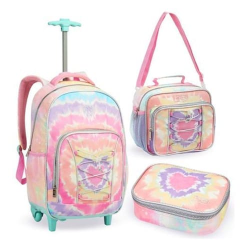 Kit de Mochila de Rodinhas inclui um estojo e uma lancheira com o mesmo design, perfeito para organizar lápis, canetas e outros materiais escolares, e uma lancheira que mantém a comida fresca e deliciosa. Sua filha vai adorar levar esse conjunto para a escola, tornando-se o destaque entre os colegas. Possui ótimo espaço interno para transportar livros e cadernos, mochila resistente para uso de dia dia