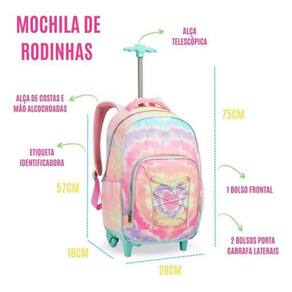 Características do produto: Mochila de rodinha - Rodinhas de silicone de alta resistência - 2 bolsos laterais para garrafa e objetos pequeno - Alças reforçada - Alças de ombro acolchoadas - Alça de mão acolchoada - Puxadores de zíper personalizada - Identificador no verso - Tamanho com rodinhas aproximado: 57cm x 28cm x 18cm - Altura total com haste puxado: 75cm