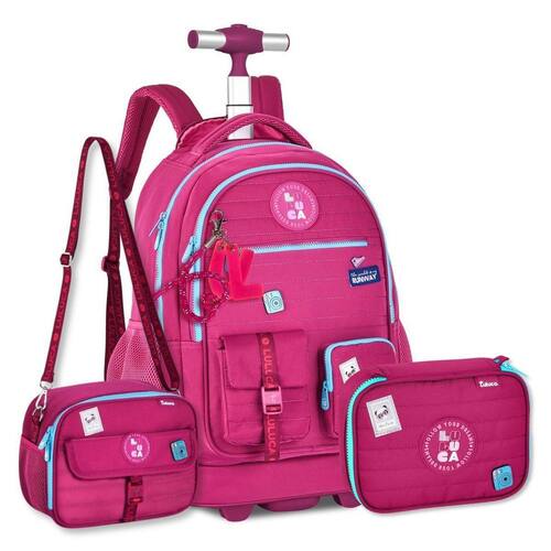 Kit Mochila de Carrinho Luluca LU24634 + Lancheira Térmica LU24637 + Estojo Box LU24640: Estilo, Praticidade e Qualidade em Cada Detalhe Se você ou sua filha são fãs da Luluca e buscam uma mochila que seja um reflexo perfeito de estilo, organização e funcionalidade, a Mochila LU24634 é a escolha ideal Com design encantador e qualidade premium, ela oferece a versatilidade que você precisa para o dia a dia escolar ou atividades diversas. A Mochila LU24634 pode ser Utilizado tanto no carrinho quanto nas costas, adaptando-se a qualquer necessidade com conforto e praticidade. Para uso no carrinho, suas 2 rodinhas traseiras e base de apoio frontal garantem estabilidade e movimentação fácil. Além disso, o bolso para guardar as alças mantém tudo organizado. Ao usá-la nas costas, suas alças ajustáveis e confortáveis proporcionam leveza e comodidade, enquanto a proteção inteligente cobre as rodinhas para evitar sujeira nas roupas. Há ainda um bolso exclusivo para guardar o puxador metálico quando não estiver em uso. Seu interior é um exemplo de organização e funcionalidade. O compartimento principal amplo inclui espaço acolchoado especial para notebooks, mantendo seus itens mais valiosos protegidos. Os dois compartimentos frontais com zíper são ideais para itens essenciais, enquanto dois bolsos adicionais - um com zíper e outro com botão magnético - oferecem ainda mais opções para guardar tudo o que você precisa. E, claro, os bolsos laterais telados são perfeitos para garrafas ou pequenos objetos de fácil acesso. O zíper bicolor e o chaveiro incrível de corda e outros de acrílico completam o charme deste modelo que é simplesmente irresistível. Confeccionada em nylon com matelassê, a mochila une sofisticação e durabilidade. Seus cadarços logados acetinados, pins de metal e etiqueta de borracha são detalhes únicos que destacam sua autenticidade e estilo exclusivo. Dimensões aproximadas: 48x35x19 cm. Lancheira LU24637 Estilo e funcionalidade em um único item. Com design encantador, é perfeita para conservar os alimentos organizados e fresquinhos. Compartimento principal térmico, garantindo que os alimentos fiquem na temperatura ideal. Bolso frontal com fechamento por fivela moderna e lateral telado. Alça de ombro ajustável para conforto no transporte. Dimensões aproximadas: 20x24x14 cm. Estojo Box LU24640 Compacto e funcional, ideal para organizar seus materiais escolares com eficiência. Possui: Espaço interno com elásticos para até 36 lápis, além de um estojo adicional com zíper. Dimensões aproximadas: 22x16x06 cm. Marca: Não Informado