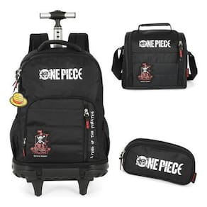 - amplo compartimento principal para melhor organização dos cadernos, livros e apostilas; - 1 compartimentos frontais com fechamento em zíper, para pequenos objetos; - dispõe de alça de mão e alça retrátil reforçada para uma melhor locomoção; - alças acolchoadas e reguláveis caso queira transportar no ombro; - puxadores dos zíperes em borracha; - aplique com acabamento bordado - chaveiro personalizado - logo one piece estampado - material: 100% poliéster e forro 100% poliéster.