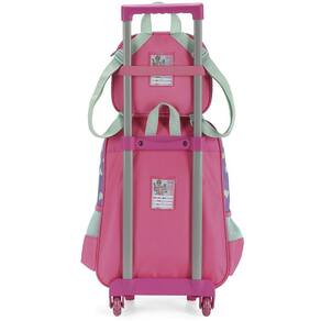Kit mochila de rodinhas com bolsos laterias em tela com elástico, alças de costas espumadas e reguláveis, silk frontal, bolso frontal com zíper, alça de mão. Lancheira estampada com alça de costas e alça de mão, além de etiquetas personalizadas.