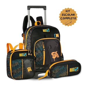 O Kit Mochila de Rodinhas Infantil Masculina Skate SK25046K com Lancheira Térmica SK25048L e Estojo SK25049E é a escolha perfeita para meninos que amam praticidade, organização e muito estilo no dia a dia escolar. A mochila, confeccionada em poliéster resistente, conta com frente em telado duplo, etiqueta emborrachada e puxadores personalizados, além de compartimento principal espaçoso, bolsos frontais com zíper - sendo um com recorte em EVA que cria efeito 3D - e bolsos laterais telados para garrafinhas. Pode ser Utilizado como carrinho, com puxador em alumínio, rodinhas resistentes e base de apoio, ou nas costas, através das alças ajustáveis e acolchoadas. Acompanha a lancheira térmica SK25048L, prática e versátil, com ótimo espaço interno e fechamento em zíper que mantém os alimentos bem conservados. Possui alça de mão, alças de costas ajustáveis e alça carona para acoplar na mochila de rodinhas, oferecendo total comodidade. Completando o conjunto, o estojo SK25049E traz design moderno, alça de mão, puxador de zíper personalizado e amplo espaço interno para lápis, canetas e demais acessórios escolares. Assim como os outros itens, é confeccionado em poliéster de alta qualidade com frente em telado duplo e etiqueta emborrachada. Com estampa autêntica inspirada no skate, repleta de manobras e símbolos da modalidade, este kit é resistente, prático e cheio de atitude, garantindo que os pequenos estejam sempre preparados para a escola com organização e muito estilo. Dimensões aproximadas: Mochila: 40x30x13cm Lancheira: 23x20x11cm e Estojo:21x9x6cm