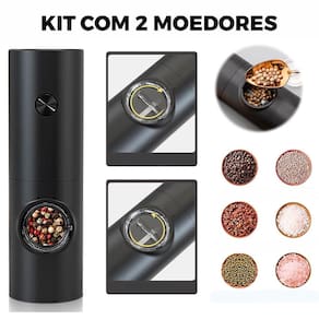 Kit com 2 moedores elétricos a pilha para grãos, temperos, sal e pimenta. Possui recipiente em ABS, capacidade de 100g e luz para auxiliar na moagem em ambientes com pouca iluminação.Base recarregável
