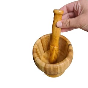 Pilão com socador (12 cm): ideal para macerar alho, ervas e especiarias, intensificando os sabores de forma prática e natural.