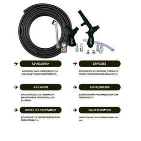 Kit de Acessórios para Compressor de Ar - Completo para Diversas Aplicações Este kit completo de acessórios para compressor de ar é ideal para quem busca versatilidade e eficiência em suas atividades diárias. Inclui: 1 Ferramenta de aplicação de ar com bico curto 1 Ferramenta de aplicação de ar com bico alongado 1 Bico de encher pneu 3 Conectores engate rápidos macho 2 Conectores rosca 1/4 com saída 5/16 2 abraçadeiras para a mangueira 1 Engate Rápido 1/4 com rosca 1/4 1 Mangueira 5/16 com 10 metros Aplicações: - Limpeza de superfícies e equipamentos Encher pneus e infláveis Conectar e desconectar mangueiras de ar rapidamente Compatibilidade: ideal para uso em oficinas, garagens e indústrias Compatível com a maioria dos compressores de ar disponíveis no mercado Características: alta resistência e durabilidade Fácil de usar e instalar Versatilidade para diversas tarefas Garanta já o seu kit e otimize suas atividades com ferramentas de qualidade e confiabilidade. Ideal para quem busca eficiência e praticidade no dia a dia.