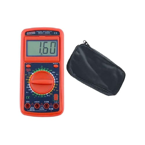 KIT MULTÍMETRO DIGITAL MOD.MD-360 3½ DÍG. PARA TENSÃO, CORRENTE, RESISTÊNCIA, CAPACITÂNCIA, DIODO E TRANSISTOR (HFE) + DESCRIÇÃO: Multímetro digital mod.md-360 3½ díg. para tensão, corrente, resistência, capacitância, diodo e transistor (hfe) Estojo mod. es-01 p/ diversos aparelhos ESPECIFICAÇÕES TÉCNICAS: MULTÍMETRO DIGITAL MOD.MD-360: Display: LCD 3 ½ dígitos 2000 contagens Display inclinável até 90º Taxa de amostragem: 2/3 vezes por segundo Tensão DC: 200mV, 2V, 20V, 200V, 1000V Resolução: 100mV, 1mV, 10mV, 100mV, 1V Precisão: ± 0,5% da leitura + 1 dígito Tensão AC: 200mV, 2V, 20V, 200V, 750V Resolução: 100mV, 1mV, 10mV, 100mV, 1V Precisão: ± 0,8% da leitura + 3 dígitos Corrente DC: 2mA, 20mA, 200mA, 20A Resolução: 1µA, 10µA, 100µA, 10mA Precisão básica: ± 1,3% da leitura + 1 dígito Corrente AC: 2mA, 20mA, 200mA, 20A Resolução: 1µA, 10µA, 100µA, 10mA Precisão básica: ± 1,9% da leitura + 3 dígitos Resistência: 200?, 2K?, 20K?, 200K?, 2M?, 20M?, 200M? Resolução: 0,1?, 1?, 10?, 100?, 1k?, 10k? Precisão básica: ± 1% da leitura + 2 dígitos Capacitância: 20nF, 200nF, 2mF, 20mF, 50mF Precisão: ± 2,5% de leitura + 1 dígito. Tempo de Resposta: 2 a 3 vezes por segundo Zero automático de medição de capacitância Botão Hold: Congelamento de leitura das escalas Teste de diodo, transistor (hFE) 0~1000 e continuidade audível (Bip) Indicação de sobre-escala: "1" aparece no display Indicação automática de polaridade negativa Indicação de bateria fraca Temperatura de Operação: 0 a 40ºC Temperatura e umidade de armazenamento: -10º a 50ºC / 75% Categoria de Segurança: CAT II – 600V CAT III - 220V Alimentação: 1 Bateria de 9V Dimensões: 88 x 172 x 36mm Desligamento automático Peso: 340g ESTOJO ES-01:Material: Estojo de vinil com zíper Cores: Preto Dimensões: 115 x 240 x 40mm ACESSÓRIOS FORNECIDOS: Multímetro digital MD-360 Bateria de 9V Holster Pontas de prova Estojo transporte ES-01 Manual de instruções