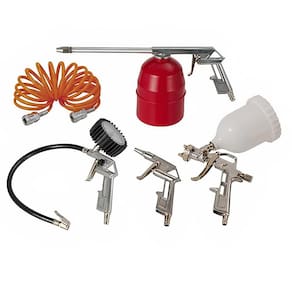 O Air Kit é formado por cinco peças: pistola para pintura, pistola para pulverização, pistola para limpeza, calibrador de pneus com manômetro e mangueira em espiral de 3 metros.