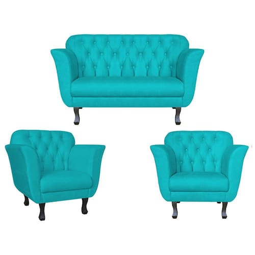 Kit Namoradeira + 2 Poltronas Decorativa Dália Suede Azul Tifany Pés Madeira Ms Decor