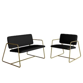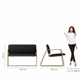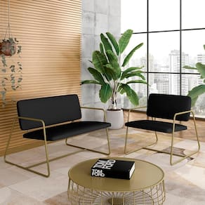 Detalhes Técnicos - Assentos e Encostos Tapeçados, Estofados e Fixos - Densidade do Assento e Encosto: D20 - Tonalidade Estrutura: Dourado - Tonalidade do Tecido: Suede Preto - Material: Metalon - Medida Poltrona Namoradeira: A:75CM x L:104CM x P:85CM - Medida Poltrona: A:75CM x L:68CM x P:85CM - Medida do chão até o assento: 45cm de altura - Poltrona e Namoradeira suporta até 120KG (cada) - Montagem: Difícil