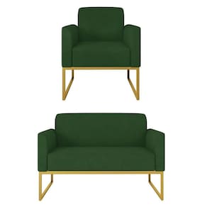 Cada escolha é uma oportunidade de imprimir o que sentimos, e para Sala de Estar desejamos conforto e beleza, para a hora de um bate-papo ou um belo café da tarde. O Kit Namoradeira e 1 Poltrona Decorativa Base Industrial Dourada Maressa S23 Suede Verde - Ibiza pode transformar seu ambiente em algo único, sua estrutura em metal é firme e com fino acabamento, o estofado é macio e traz a leveza que o Estilo Industrial pode fazer em sua essência.