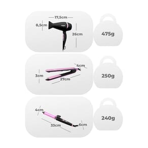 Conteúdo da Embalagem 1 x Secador 1 x Chapinha com placas cerâmicas 1 x Modelador de cachos 1 x Acessório: concentrador de ar (para o secador) 1 x Manual de instruções