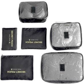 Especificações Técnicas:- Quantidade: 6 peças- Cor: Preto- Material: Poliéster resistente- Fechamento: Zíper- Indicação: Organização de roupas, acessórios, cosméticos e itens pessoais para viagens