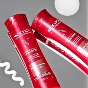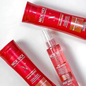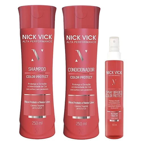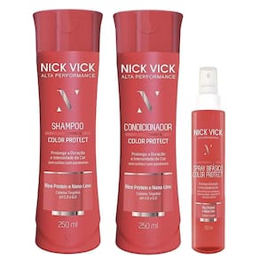 O Kit Shampoo Condicionador e Spray Bifásico Color Protect da Nick Vick da linha Alta Performance restaura e protege a cor dos cabelos coloridos e mechados de todas as cores, sem depositar pigmento.