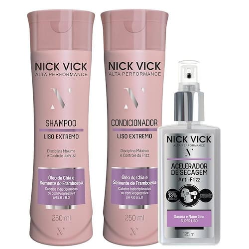 O Kit Shampoo Condicionador Fluido Acelerador Liso Extremo Nick Vick foi desenvolvido para atender o desejo de um efeito liso por mais tempo com a hidratação dos fios e selagem das cutículas.
