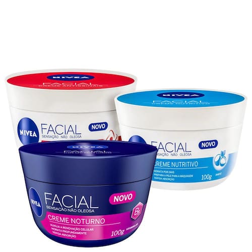 Kit NIVEA Facial Trio traz uma linha de cremes especiais para o cuidado do seu rosto. Cada fórmula oferece uma ação: Nutritivo, prepara a pele para a maquiagem e proporciona 24h de hidratação; Antissinais, que firma e reduz as linhas de expressão; e Noturno, que além de hidratar, auxilia na renovação celular e deixa aparência de pele descansada.