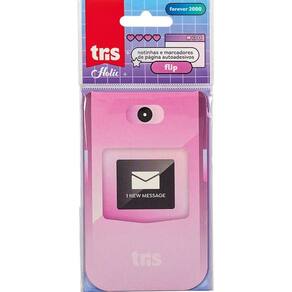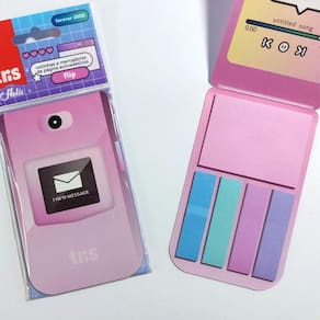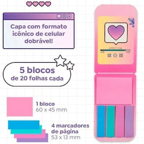 O kit de notas autoadesivas Flip é inspirado no celular mais icônico da época e possui 1 bloco de notinhas e 4 blocos de marcadores de páginas. Cada bloco possui 20 folhas.