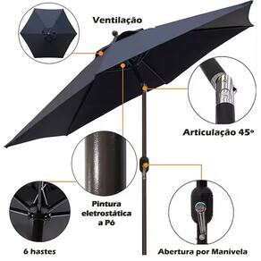 ( Fácil Operação ) O ombrelone facilita o uso. Basta girar a manivela para abrir o ombrelone. Caso deseja alterar a inclinação da cobertura é só pressionar o botão na articulação.