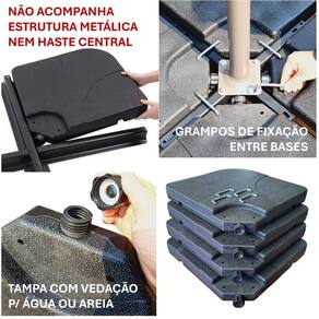 O Ombrelone vem com um pé cruzado. Deve ser fixado fixo com parafusos ao piso ou então sustentado com uma base pesada que pode ser placas de pedra, concreto ou então a solução mais prática que são as bases plásticas com preenchimento por água ou areia (disponível separadamente).