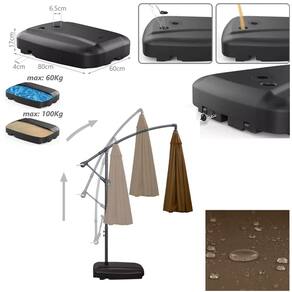O Ombrelone vem com um pé cruzado. Deve ser fixado fixo com parafusos ao piso ou então sustentado com uma base pesada que pode ser placas de pedra, concreto ou então a solução mais prática que são as bases plásticas com preenchimento por água ou areia (disponível separadamente).