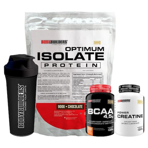 Kit Optimum Isolate Whey Protein 900g + BCAA 100g + Power Creatina 100g + Coqueteleira - Bodybuilders Sabor: Chocolate Optimum Isolate Whey Protein é um suplemento alimentar formulado com um blend das mais nobres proteínas disponíveis como: proteína isolada de soro de leite, proteína hidrolisada do trigo glutamina peptídeo , caseína, proteína isolada da soja e albumina, com diferentes tempos de absorção pelo organismo, garantindo assim uma adequada ingestão proteica, ajudando a construir um corpo mais forte e definido. Optimum Isolate Whey Protein é rico em BCAAs e outros aminoácidos essenciais que podem proporcionar mais energia e força, garantindo um melhor desempenho, para auxiliar no volume e definição muscular. O BCAA é um suplemento altamente utilizado por pessoas que buscam levar uma vida mais saudável em conciliação com uma alimentação também saudável e a prática de atividades físicas. O BCAA faz parte dos aminoácidos de cadeia ramificada contendo em sua fórmula: Leucina, Valina e Isoleucina. Essas mesmas moléculas presentes no BCAA são encontradas nas fibras musculares, porém em maior quantidade, equivalendo 35% dos principais aminoácidos presente na proteína muscular. Elementos esses que contribuem para uma recuperação rápida e eficaz dos exercícios físicos praticados e no ganho de massa. Por essa razão são tão importantes para quem treina pesado. A cretina é uma substância derivada de aminoácidos que age como reserva de energia nas células dos músculos. Podendo ser consumida como suplemento pré-treino, a creatina monohidratada ajuda a hidratar a musculatura enquanto você malha, promovendo o aumento, força e firmeza. O suplemento de creatina da IntegralMédica oferece um ótimo custo x benefício, pois a embalagem conta com 300 gramas que rende porções para você usufruir de uma suplementação de qualidade por mais tempo, e sentir sua evolução nos treinos. A coqueteleira Padrão Bodybuilders é confeccionada com materiais livre de BPA e Ftalato, com modelo slim e fechamento em click é ideal para os treinos diários.