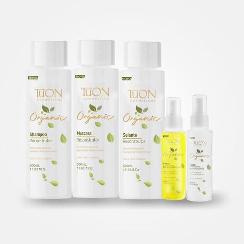 KIT ORGANIC 5 SHAMPOO, MÁSCARA, SELANTE, FUSÃO E FLUÍDO - TUON - DESCRIÇÃO COMERCIAL: Shampoo:Reposição e reestruturação definitiva e complementar com oligoelementos biotecnológicos que promovem homeostasia celular nos fios de cabelo, onde o estado de equilíbrio entre recuperação, proteção e blindagem é obtido com o uso da linha completa que trata os fios de ponta a ponta. Os ativos repõem silício, zinco e magnésio.Mascara:Reposição e reestruturação definitiva e complementar com oligoelementos biotecnológicos que promovem homeostasia celular nos fios de cabelo, onde o estado de equilíbrio entre recuperação, proteção e blindagem é obtido com o uso da linha completa que trata os fios de ponta a ponta. Os ativos repõem silício, zinco e magnésio.Fusao:Reposição e reestruturação definitiva e complementar com oligoelementos biotecnológicos que promovem homeostasia celular nos fios de cabelo, onde o estado de equilíbrio entre recuperação, proteção e blindagem é obtido com o uso da linha completa que trata os fios de ponta a ponta. Os ativos repõem silício, zinco e magnésio.Fluido:Reposição e reestruturação definitiva e complementar com oligoelementos biotecnológicos que promovem homeostasia celular no fio de cabelo onde o estado de equilíbrio entre recuperação, proteção e a blindagem é obtido com o uso da linha completa que trata de ponta a ponta os fios. Os ativos repõe, silício, zinco e magnésio. Selante:Reposição e reestruturação definitiva e complementar com oligoelementos biotecnológicos que promovem homeostasia celular no fio de cabelo onde o estado de equilíbrio entre recuperação, proteção e a blindagem é obtido com o uso da linha completa que trata de ponta a ponta os fios. Os ativos repõe, silício, zinco e magnésio. - DETALHE TÉCNICO: Shampoo:Hidratação e reposição de nutrientes são responsáveis pela ação dos oligoelementos que agem na aparência dos cabelos. Sua ação está baseada na proteção da superfície do fio e visa promover um processo de regeneração e aumento do conteúdo hídrico, responsável pela hidratação, na fibra capilar. O silício fortalece, o magnésio diminui a queda e o zinco auxilia no crescimento.Mascara:Hidratação e reposição de nutrientes são responsáveis pela ação dos oligoelementos que agem na aparência dos cabelos. Sua ação está baseada na proteção da superfície do fio e visa promover um processo de regeneração e aumento do conteúdo hídrico, responsável pela hidratação, na fibra capilar. O silício fortalece, o magnésio diminui a queda e o zinco auxilia no crescimento.Fusão:Hidratação e reposição de nutrientes são responsáveis pela ação dos oligoelementos que agem na aparência dos cabelos. Sua ação está baseada na proteção da superfície do fio e visa promover um processo de regeneração e aumento do conteúdo hídrico, responsável pela hidratação, na fibra capilar. O silício fortalece, o magnésio diminui a queda e o zinco auxilia no crescimento.Fluido:Hidratação e reposição de nutrientes são responsáveis pela ação dos oligoelementos que agem na aparência dos cabelos. Sua ação está baseada na proteção da superfície do fio e visa promover um processo de regeneração e aumento do conteúdo hídrico, responsável pela hidratação, na fibra capilar. O silício fortalece, o magnésio diminui a queda e o zinco auxilia no crescimento.Selante:Hidratação e reposição de nutrientes são responsáveis pela ação dos oligoelementos que agem na aparência dos cabelos. Sua ação está baseada na proteção da superfície do fio e visa promover um processo de regeneração e aumento do conteúdo hídrico, responsável pela hidratação, na fibra capilar. O silício fortalece, o magnésio diminui a queda e o zinco auxilia no crescimento. - APLICAÇÃO: Shampoo: O Shampoo Reconstrutor Reposição de Nutrientes possui propriedades suaves ao lavar os cabelos, promovendo hidratação, brilho e maleabilidade dos fios ao toque úmido. Desenvolvido a partir de ingredientes naturais e baseado no princípio da necessidade dos cabelos desidratados e sensibilizados, o shampoo hidrata profundamente os fios, recuperando a integridade capilar de ponta a ponta. Ele tem um equilíbrio de agentes que limpam suavemente e condicionam os fios, proporcionando maciez aos cabelos sem deixá-los estáticos. Além disso, forma um filme de proteção que aumenta a resistência e elasticidade dos fios. Não contém sal, parabenos, petrolatos ou silicones e não é testado em animais.Mascara:O Máscara Reconstrutor Repositor de Nutrientes, possui propriedades altamente condicionantes, promove desembaraço instantâneo, hidratação, brilho e maleabilidade dos fios ao toque úmido e depois de seco. Desenvolvido a partir de ingredientes naturais, baseado no princípio da necessidade dos cabelos desidratados e sensibilizados, hidrata profundamente os fios recuperando a integridade capilar de ponta a ponta a Máscara tem um equilíbrio de agentes que mantém os fios tratados por longa duração, formando um filme de proteção que aumenta a resistência e elasticidade. Não contém, Parabenos, Petrolatos, Silicones. Não testados em animais.Fusão:O Fusão Nutri Catiônica Reconstrutor Repositor Nutrientes, é ultra concentrado em agentes hidratantes de caráter catiônico, promove um condicionamento desde a primeira aplicação, age diretamente na cutícula dos fios dando mais vitalidade e leveza para os cabelos com toque aveludado sem pesar nos fios, além de formar um filme molecular uniforme que proporciona brilho intenso e realça a cor em cabelos naturais, descoloridos e coloridos.Fluido:O Fluido Bio Queratinizado Reconstrutor Repositor Nutrientes, age diretamente na cutícula dos fios dando mais vitalidade e beleza para os cabelos, além de auxiliar no crescimento capilar, oferece ação anti emborrachamento e repõe queratina cauterizando as f