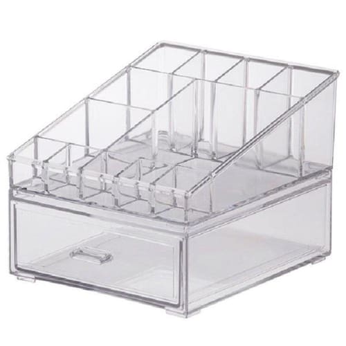 - Com o Organizador de Cosméticos sua bancada ficará organizada e seus produtos de beleza sempre a mãos. Contém 1 gaveta com tamanho ideal para paletas de sombra ou blush, 5 divisórias para batons ou esmalte e mais 7 divisórias para pincéis, demaquilantes, bases e o que mais você quiser. Confeccionado em material resistente e transparente ele é o guardião perfeito para as suas joias.