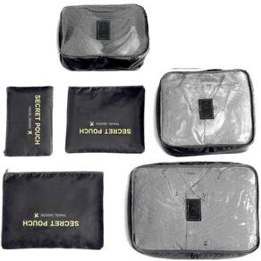 Kit Organizador para Mala 6 em 1 – Diversos Tamanhos e Bolsos com Zíper – Cor Preta Conjunto organizador com 6 peças de diferentes tamanhos, indicado para facilitar o armazenamento de roupas e acessórios dentro de malas de viagem. Os compartimentos ajudam a distribuir os itens de forma ordenada, tornando o manuseio mais prático.
