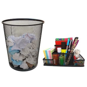 Kit organizador de mesa e lixeira de escritório Kit: preto Kit escritório com 2 unidades Para quem gosta de ter tudo sempre à mão, com agilidade e praticidade. O kit de organizador de mesa e a lixeira de escritório é ideal para você.Com eles, você vai evitar a perda de tempo procurando os itens de que precisa e que usa com frequência. Tudo estará a sua mão. O organizador de mesa de escritório tem 4 partes com tamanhos variados. permitindo organiza canetas, lápis, clips, bloco de notas e pequenos objetos. Kit escritório composto por:- 01 organizador de mesa escritório com 4 partições - 01 lixeira aramada Material: metal - organizador de mesa escritório tamanho: 20x10x10cm largura x altura x comprimento - lixeira tamanho: 27x23,5x18,5cm altura x diâmetro da boca x diâmetro da base Marca: Markys Store