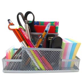 O organizador de mesa de escritório tem 4 partes com tamanhos variados. permitindo organiza canetas, lápis, clips, bloco de notas e pequenos objetos.