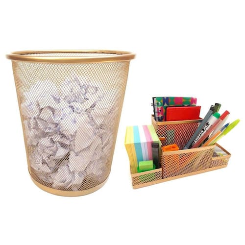 Kit Escritório DOURADO OURO com 2 unidades Para quem gosta de ter tudo sempre à mão, com agilidade e praticidade. Kit Organizador de Mesa e a Lixeira de escritório é ideal para você. Com eles, você vai evitar a perda de tempo procurando os itens de que precisa e que usa com frequência. Tudo estará a sua mão. O organizador de mesa de escritório tem 4 partes com tamanhos variados. Permitindo organiza canetas, lápis, clips, bloco de notas e pequenos objetos. KIT ESCRITÓRIO DOURADO OURO COMPOSTO POR: - 01 Organizador de mesa escritório Dourado Ouro com 4 partições - 01 Lixeira Aramada Dourado Ouro Cor: DOURADO OURO Material: METAL - Organizador de mesa escritório Tamanho: 20x10x10cm (Largura x Altura x Comprimento) - Lixeira Tamanho: 27x23,5x18,5cm (Altura x Diâmetro da boca x Diâmetro da base)