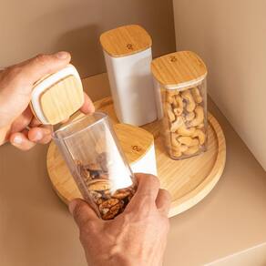 ASPEN DECOR F6317 Kit Organizador Giratório + 4 Potes Herméticos Keep 150ml e 340ml O Kit Organizador Giratório com Potes Herméticos Keep da Aspen Decor proporciona praticidade e organização para a sua cozinha. O organizador giratório de 360 em bambu permite acesso fácil aos itens e torna o ambiente mais sofisticado e funcional. Os potes herméticos, com capacidades de 150ml e 340ml, possuem tampa de bambu com vedação que bloqueia a entrada de ar, garantindo frescor e proteção para seus temperos e alimentos. Feitos com materiais duráveis e sustentáveis, esses produtos aliam beleza e funcionalidade, promovendo mais tranquilidade e bem-estar na sua rotina. Conteúdo do Kit: 01 Organizador Giratório Multiuso em Bambu 25 x 2,5 cm : Design 360 para fácil acesso aos itens, ideal para temperos, condimentos ou outros utensílios de cozinha. 01 Pote Hermético Keep de 150ml: Design compacto, ideal para temperos; bloqueia a luz e preserva o frescor. Dimensões: 6,5 x 6,5 x 7 cm. 03 Potes Herméticos Keep de 340ml: Capacidade maior para armazenamento de alimentos, com vedação hermética e design modular. Dimensões: 6,5 x 6,5 x 13,5 cm. Destaques do Kit: Organização Completa: Kit que inclui armazenamento modular e organizador giratório para um ambiente de cozinha otimizado. Sustentabilidade e Elegância: Produtos em bambu, um material 100% renovável, trazendo um toque natural à decoração. Vedação Hermética nos Potes: Prolonga a frescura dos alimentos ao bloquear a entrada de ar e proteger contra a luz. Funcionalidade e Praticidade: Organizador giratório para acesso rápido e potes resistentes, fáceis de limpar e organizar. Transforme o ambiente e valorize a conservação de alimentos com o Kit Organizador Giratório + Potes Herméticos da Aspen Decor Aviso Importante: As cores dos produtos podem apresentar variações em relação às imagens exibidas devido à calibração do monitor ou smartphone. Atenção: Os objetos que ambientam as fotos não acompanham o produto. Imagens meramente ilustrativas. Observação: Confira as dimensões do produto no momento da compra As medidas estão detalhadas na descrição para garantir que ele seja exatamente o que você procura. Marca: Não Informado
