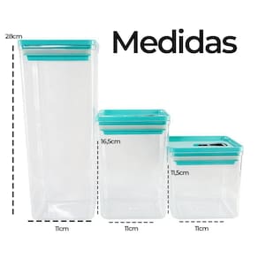 Feito para quem busca mais organização na cozinha, nosso kit de organizadores herméticos será a solução ideal! Seu design conta com 3 tamanhos e capacidades diferentes, os organizadores são perfeitos para todas as suas necessidades, podendo guardar diversos tipos de alimentos com facilidade, possuindo uma abertura com alavanca, além da vedação hermética e possibilidade de empilha-los. Protegendo contra umidade, poeira e inseto, os organizadores mantêm os alimentos frescos e intactos em casa ou qualquer lugar que deixe.Feito com materiais de alta qualidade, eles são fáceis de limpar e oferecem resistência para o uso contínuo, além disso, a sua transparência facilita a visualização do conteúdo e seu design empilhável economiza ainda mais espaço. ESPECIFICAÇÕES:Material: Peças em Plástico Injetado PP e PSC, Vedação em TPUDimensões:-Organizador Pequeno: Alt.: 11,5cm x Larg.: 11cm-Organizador Médio: Alt.: 16,5cm x Larg.: 11cm -Organizador Grande: Alt.: 28cm x Larg.: 11cmPeso: Aprox. 730gCapacidade:-Pequeno: 1 Litro-Médio: 1,5 Litros-Grande: 2,5 LitrosCor: Transparente com Tampa Verde Tiffany CONTÉM:01 KIT COM 3 ORGANIZADORES HERMÉTICOS 5 LITROS - VERDE TIFFANYFeito para quem busca mais organização na cozinha, nosso kit de organizadores herméticos será a solução ideal! Seu design conta com 3 tamanhos e capacidades diferentes, os organizadores são perfeitos para todas as suas necessidades, podendo guardar diversos tipos de alimentos com facilidade, possuindo uma abertura com alavanca, além da vedação hermética e possibilidade de empilha-los. Protegendo contra umidade, poeira e inseto, os organizadores mantêm os alimentos frescos e intactos em casa ou qualquer lugar que deixe.Feito com materiais de alta qualidade, eles são fáceis de limpar e oferecem resistência para o uso contínuo, além disso, a sua transparência facilita a visualização do conteúdo e seu design empilhável economiza ainda mais espaço. ESPECIFICAÇÕES:Material: Peças em Plástico Injetado PP e PSC, Vedação em TPUDimensões:-Organizador Pequeno: Alt.: 11,5cm x Larg.: 11cm-Organizador Médio: Alt.: 16,5cm x Larg.: 11cm -Organizador Grande: Alt.: 28cm x Larg.: 11cmPeso: Aprox. 730gCapacidade:-Pequeno: 1 Litro-Médio: 1,5 Litros-Grande: 2,5 LitrosCor: Transparente com Tampa Verde Tiffany CONTÉM:01 KIT COM 3 ORGANIZADORES HERMÉTICOS 5 LITROS - VERDE TIFFANY