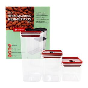Feito para quem busca mais organização na cozinha, nosso kit de organizadores herméticos será a solução ideal! Seu design conta com 3 tamanhos e capacidades diferentes, os organizadores são perfeitos para todas as suas necessidades, podendo guardar diversos tipos de alimentos com facilidade, possuindo uma abertura com alavanca, além da vedação hermética e possibilidade de empilha-los. Protegendo contra umidade, poeira e inseto, os organizadores mantêm os alimentos frescos e intactos em casa ou qualquer lugar que deixe.Feito com materiais de alta qualidade, eles são fáceis de limpar e oferecem resistência para o uso contínuo, além disso, a sua transparência facilita a visualização do conteúdo e seu design empilhável economiza ainda mais espaço. ESPECIFICAÇÕES:Material: Peças em Plástico Injetado PP e PSC, Vedação em TPUDimensões:-Organizador Pequeno: Alt.: 11,5cm x Larg.: 11cm-Organizador Médio: Alt.: 16,5cm x Larg.: 11cm -Organizador Grande: Alt.: 28cm x Larg.: 11cmPeso: Aprox. 730gCapacidade:-Pequeno: 1 Litro-Médio: 1,5 Litros-Grande: 2,5 LitrosCor: Transparente com Tampa Vermelha CONTÉM:01 KIT COM 3 ORGANIZADORES HERMÉTICOS 5 LITROS - VERMELHO