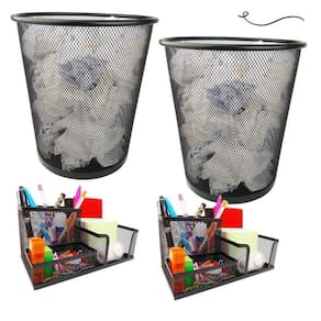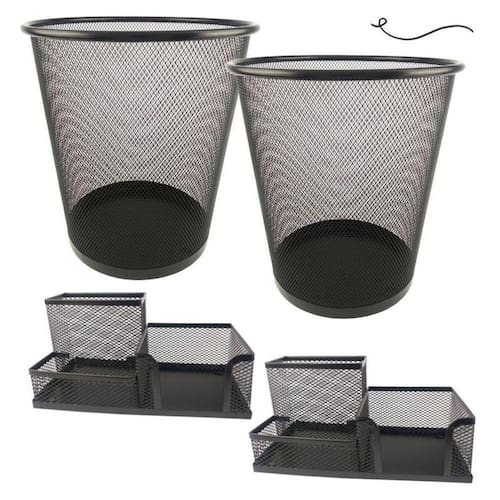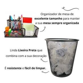 Kit organizador de mesa escritório e lixeira aramada home office preto Kit escritório com 4 unidades Para quem gosta de ter tudo sempre à mão, com agilidade e praticidade. O kit de organizador de mesa e a lixeira de escritório é ideal para você.Com eles, você vai evitar a perda de tempo procurando os itens de que precisa e que usa com frequência. Tudo estará a sua mão. O organizador de mesa de escritório tem 3 partições com tamanhos variados. Permitindo organiza canetas, lápis, clips, bloco de notas e pequenos objetos. Kit escritório composto por:- 02 organizadores de mesa escritório com 3 partições- 02 lixeiras aramada Material: metal - organizador de mesa escritórioTamanho: 20x10x10cm largura x altura x comprimento - lixeiraTamanho: 27x23,5x18,5cm altura x diâmetro da boca x diâmetro da base Marca: Markys Store
